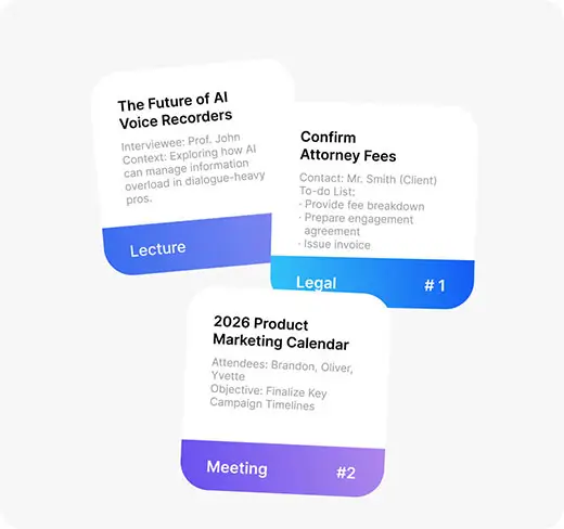- After recording, powerful AI generates structured summaries, to-dos, and mind maps for easy review and sharing.